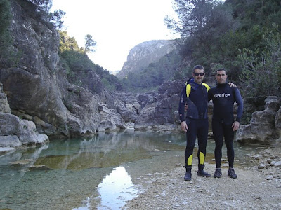 Ayer estuve en el lugar donde comenzó la leyenda. Sí, ayer descendimos el barranc de l’Encantà desde el Molí de l’Encantà hasta el río Serpis: cinco horas de remojado descenso en el que disfrutamos cada poza, cada salto, cada remanso, cada minuto. No, no exagero si digo que la temperatura del agua rondaría los 4ºC. El agua nos arañaba las manos cada vez que teníamos que nadar, es cierto, pero el resto del cuerpo lo llevábamos protegido con un traje de neopreno y la verdad es que hubo momentos en que pasamos calor.